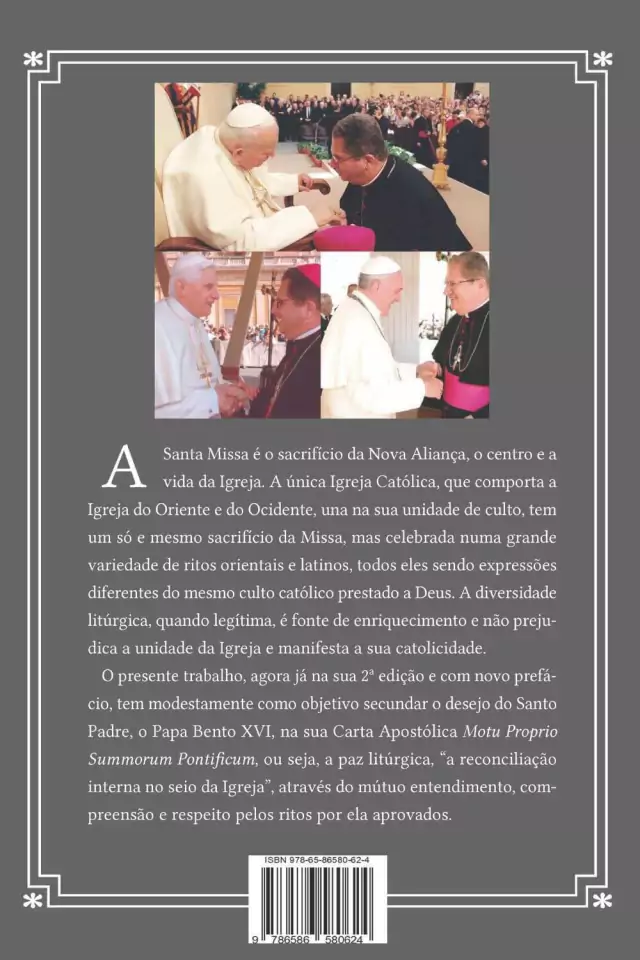 A Santa Missa é o sacrifício da Nova Aliança, o centro e a vida da Igreja. A única Igreja Católica, que comporta a Igreja do Oriente e do Ocidente, una na sua unidade de culto, tem um só e mesmo sacrifício da Missa, mas celebrada numa grande variedade de ritos orientais e latinos, todos eles sendo expressões diferentes do mesmo culto católico prestado a Deus. A diversidade litúrgica, quando legítima, é fonte de enriquecimento e não prejudica a unidade da Igreja e manifesta a sua catolicidade. O presente trabalho, agora já na sua 2ª edição e com novo prefácio, tem modestamente como objetivo secundar o desejo do Santo Padre, o Papa Bento XVI, na sua Carta Apostólica Motu Proprio Summorum Pontificum, ou seja, a paz litúrgica, "a reconciliação interna no seio da Igreja", através do mútuo entendimento, compreensão e respeito pelos ritos por ela aprovados.