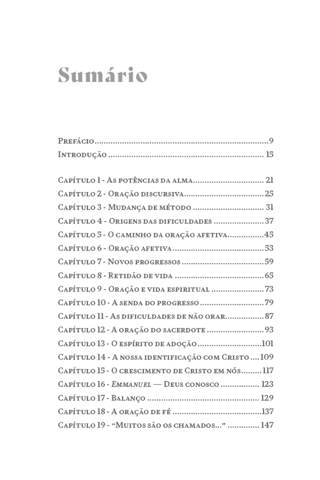 A oração é “a única coisa necessária” (cf. Lc 10 42). Apoiando-se tanto na sua experiência pessoal como nos escritos dos santos da Igreja, o autor trata neste livro dos obstáculos que o cristão — religioso, sacerdote ou leigo — encontra na sua vida de diálogo e intimidade com Deus, e sugere conselhos práticos para alcançar a vitória sobre cada um deles, desde a falta de costume até as distrações que atrapalham a alma e o coração.