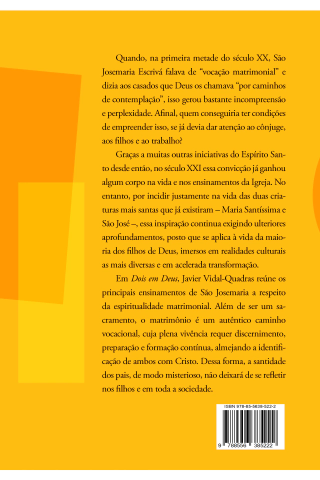 Em Dois em Deus, Javier Vidal-Quadras reúne os principais ensinamentos de São Josemaria a respeito da espiritualidade matrimonial. Além de ser um sacramento, o matrimônio é um autêntico caminho vocacional, cuja plena vivência requer discernimento, preparação e formação contínua, almejando a identificação de ambos com Cristo. Dessa forma, a santidade dos pais, de modo misterioso, não deixará de se refletir nos filhos e em toda a sociedade.