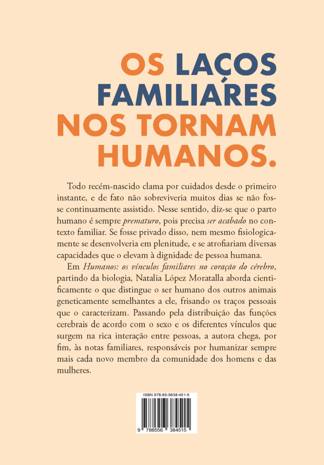 Em Humanos: os vínculos familiares no coração do cérebro, partindo da biologia, Natalia López Moratalla aborda cientificamente o que distingue o ser humano dos outros animais geneticamente semelhantes a ele, frisando os traços pessoais que o caracterizam. Passando pela distribuição das funções cerebrais de acordo com o sexo e os diferentes vínculos que surgem na rica interação entre pessoas, a autora chega, por fim, às notas familiares, responsáveis por humanizar sempre mais cada novo membro da comunidade dos homens e das mulheres.