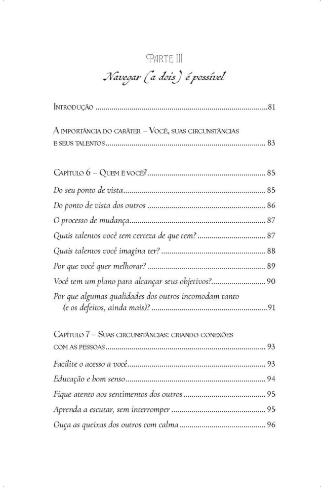 Para reavivar o companheirismo e evitar que encantadoras histórias de amor afundem, a autora sugere aqui condutas simples - ancoradas na amizade, na elegância e no bom humor - que fazem grande diferença na entrega mútua do casal, sendo como faróis que tornam mais seguro o percurso dos dois nautas até o cais.